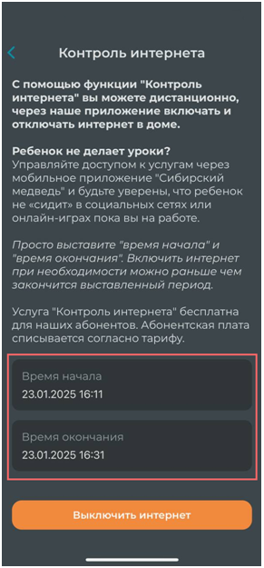 Чтобы воспользоваться данной услугой, необходимо войти в личный кабинет или в приложение “Сибирский Медведь” на телефоне. Внизу на главной странице находится раздел Контроль интернета, где будет возможность запланировать время начала и окончания периода. Для активации нажимаем на кнопку "Выключить интернет".