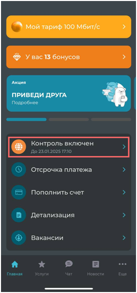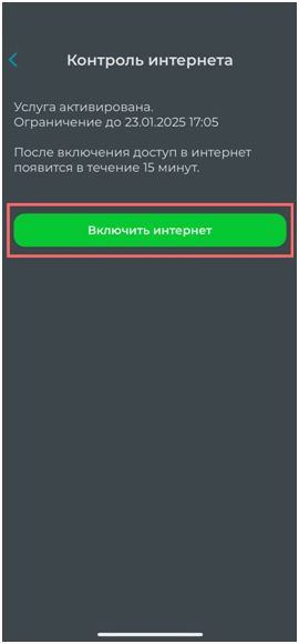 В момент, когда услуга активна, телевидение будет работать. При необходимости есть возможность отключить действие функции контроля раньше, чем истечет выставленный период. На Главном экране при активированной услуге появится раздел "Контроль включен" с указанным периодом, в котором находится кнопка "Включить интернет", отключающая услугу Контроль интернета.